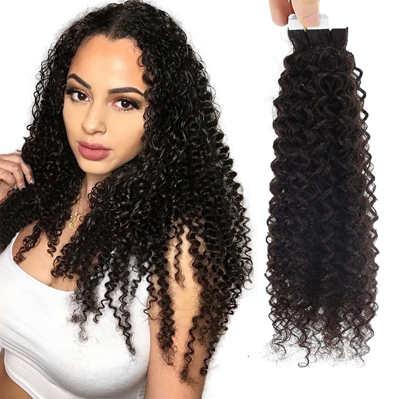 Tape in Hair Extensions Full Head Soft Curly Real Tape in Natural Hair Extensions Black Afro Kinky Curly Double Sided Tape Hair Extensions Brazilian Remy Human Hair for Women 16 Inch 20Pcs 50g
