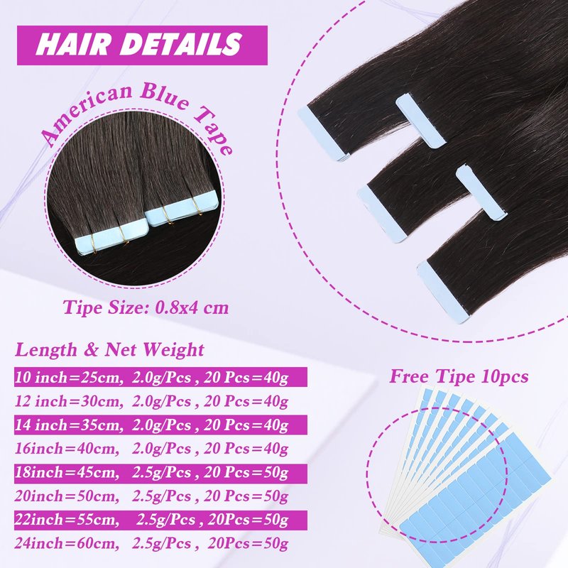 -Hair Material: Tape in Hair Extensions Human Hair -Hair Grade: Top quality -Hair Size: 10-24 Inches -Hair Color: #1B Natural Black,#1 Jet Black, #2 Dark Brown,#99J Burgundy #4P27 Medium Brown/Dark Blonde, #4 Chotolate Brown #613 Bleach Blonde. -Hair Net Weight: 10-16Inch is 40 Gram ; 18-24inch is 60 Gram -Hair Life: 6 months (Depends on usage and care) Tape Life: Suggest -Package: 2g /PCS,40g / 20PCS / PACK -Package: 2.5g /PCS, 50g / 20PCS / PACK Recommend Quantity: 2-3 sets for thick full head,4-6 sets if you like more heavy.