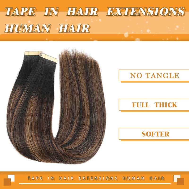 Tape in Hair Extensions Human Hair 18 Inch 20pcs Balayage Natural Black to Chestnut Brown Human Hair Extensions Tape in for Women Skin Seamless Invisible Tape Hair Extensions(1B/1B/6#, 18 Inch)