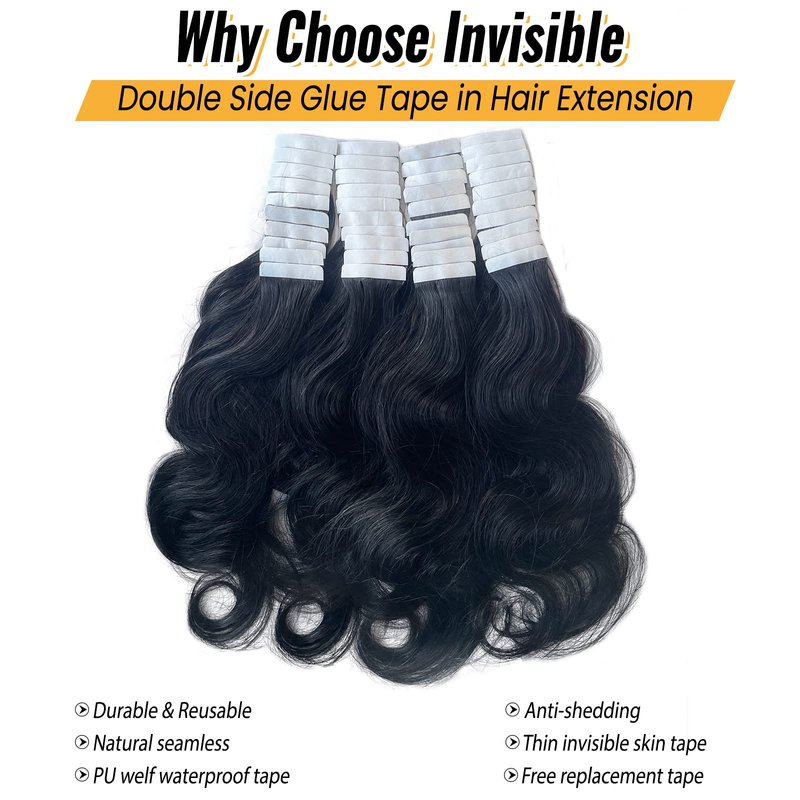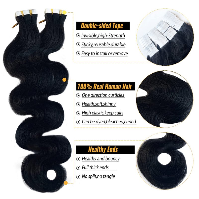 - 【High Quality Body Wave Tape in Hair Extensions】- Our body wave human hair extensions was made from unprocessed natural black 100% real human hair,salon quality, no shedding, no tangles, smooth and soft, healthy and no split ends. Body wave tape in hair extensions human hair for black women to add hair length and density, without any discomfort or injury. Body wave tape ins can be cut, washed, dyed, straighten and curled.