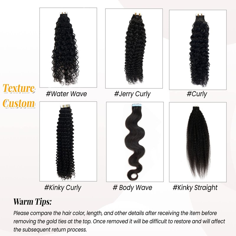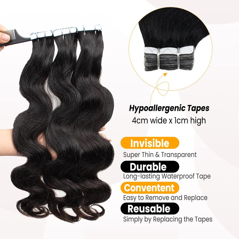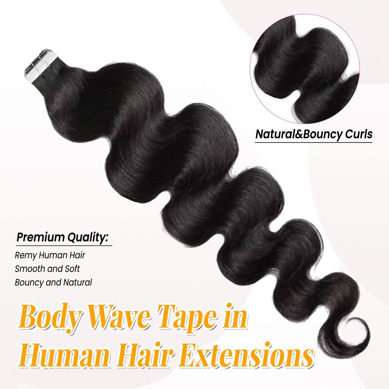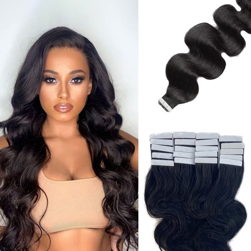 - 【10A Grade Body Wave Hair Extensions Tape ins】:The body wave tape in hair extensions are specially designed for black women/girls.10A grade,100% Brazilian remy human hair extensions,soft like your own hair.No tangles,no shedding.The tape is thin and light, without pressure, it is perfectly attached to your scalp without any discomfort or injury.Body wave remy hair extension can be cut, washed, dyed, straighten and curled.