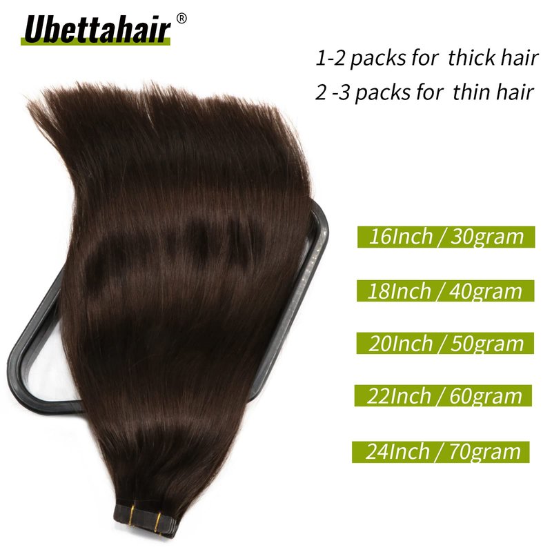 - 【Color Hair Extensions Tape ins】----Dark brown hair extensions tape in, many colored hair extensions available for you to choose, to match your own hair color . 16 Inch/30gram;18 Inch/40gram; 20Inch/50gram; 22 Inch/60gram; 22 Inch/70gram. Easy to get a desired hair length and hair volume by adding the tape in hair extensions. Getting the highlights hair extensions soon by choosing the similar colored hair extensions as your rooted hair.