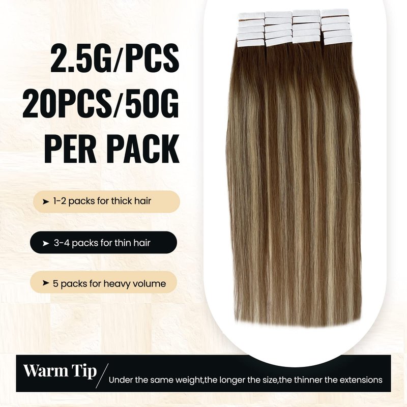 - 【50G 20PCS Tape in Hair Extensions】- Our tape in hair extensions human hair is 1.5 inch width,20pcs/50g pack, 12-24 inches for your choice. If your hair is thick, 1-2 packs to increase thickness, 2-3 packs to increase length. If your hair is thin, 2-3 packs to increase thickness, 1-2 packs to increase length, 3-4 packs to increase thickness and length. The tape ins human hair extensions is perfect for various hairstyles, looks like your own hair after tape ins.