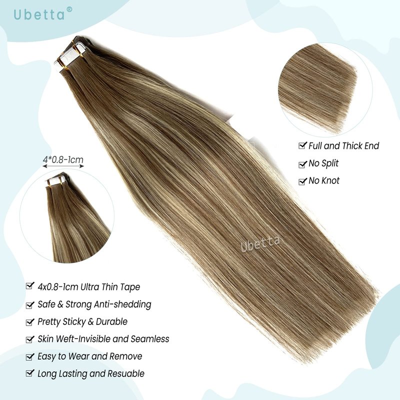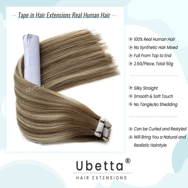 Ubetta tape in hair extensions human hair is of premium quality in affordable price, seamless skin weft and invisible tape in hair extensions real human hair easy to be naturally blended with your own hair, can be washed, flat ironed,or curled by using hot tools, just like your own hair, no shedding, no tangles, no smell, silky soft. If you want to add length,volume or add highlights strands to your hair instantly, tape in hair extensions real human hair is a perfect choice, you will be obsessed with how they turned out.