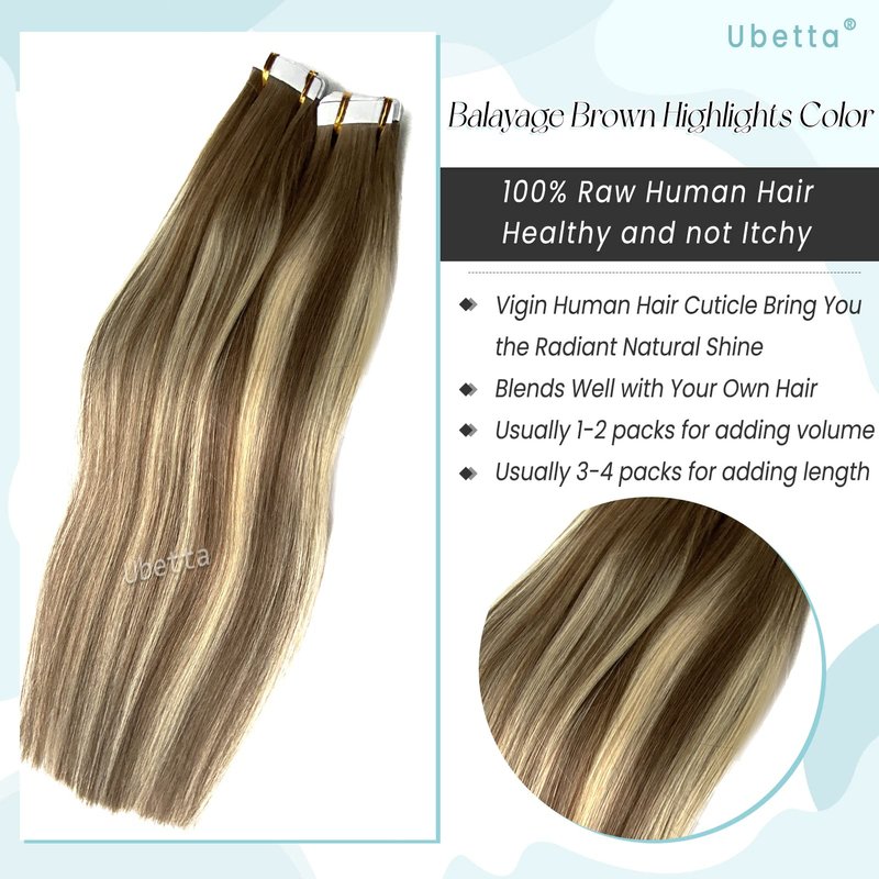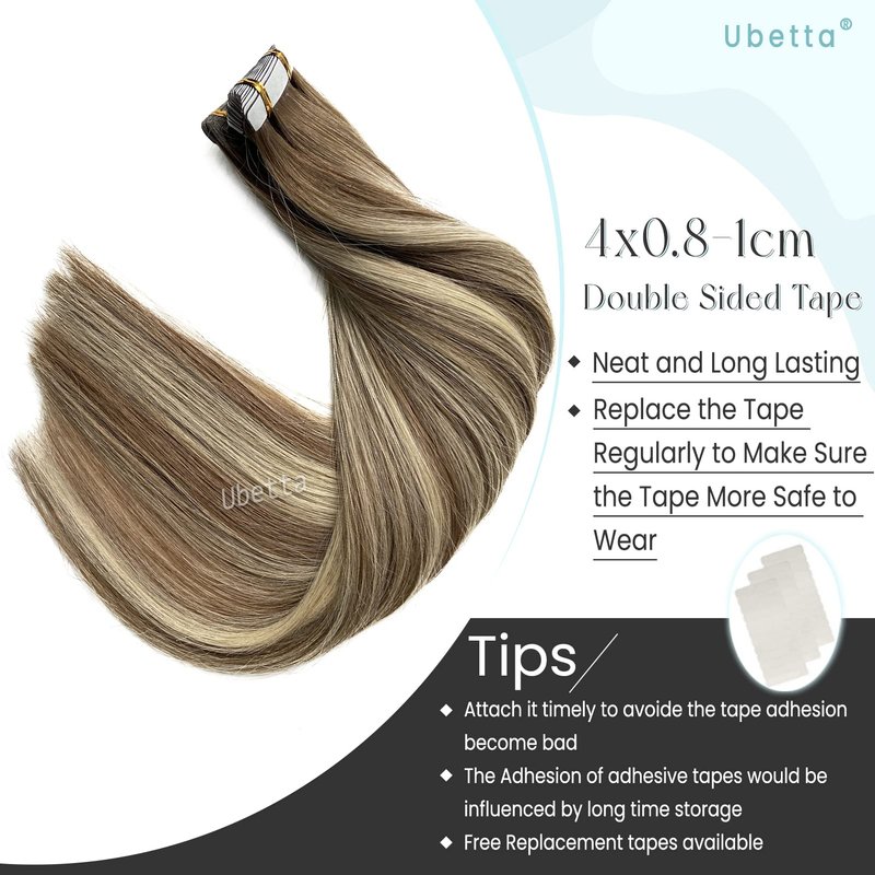 - 【Ultra Thin Invisible Tape ins】--Tape in hair extensions used double sided invisible re-usable tapes, , no hair loss,pretty sticky not easy to fall off. Replacing the tapes every 2-4 weeks to make the tape more neat and sticky, and safe to wear. Compare with clip in hair extensions, brown and blonde highlights tape in extensions is flat, more seamless and invisible, blends better with your own hair, more natural and versatile for many hairstyle: like ponytail and buns hairstyle.