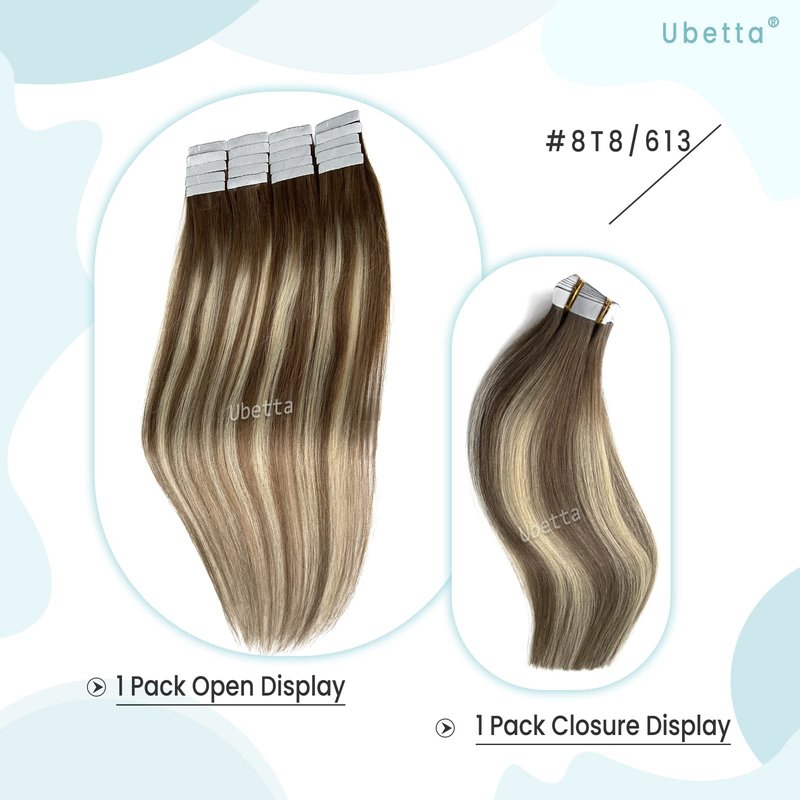 - 【20 Pieces Tape in Hair Extensions】--4x1cm thin tape hair,2.5G/PC,20 Pieces 50G/Pack. 1-2 packs 40 pieces tape ins to increase hair volume ,3-4 packs to increase hair length for thick hair women;3-4 packs to increase hair volume, 1-2 packs to increase hair length for fine thin hair women.All the pictures are real taken by Ubetta, all hair picture is true to the real hair you will receive, a little color difference for screen setting is normal, exchanging hair color is supported: ubettahair@gmail
