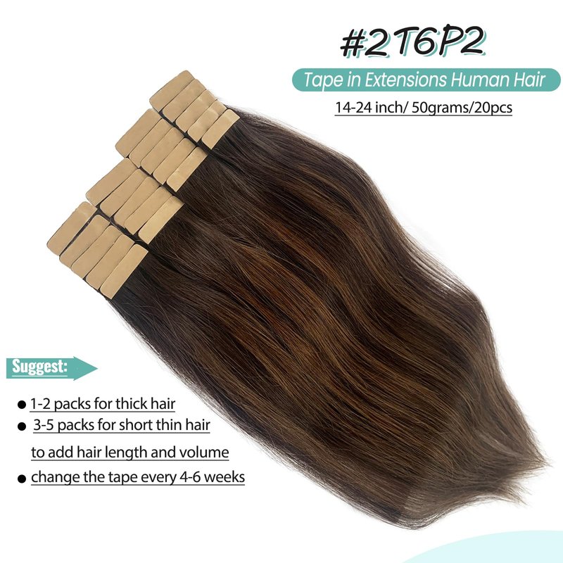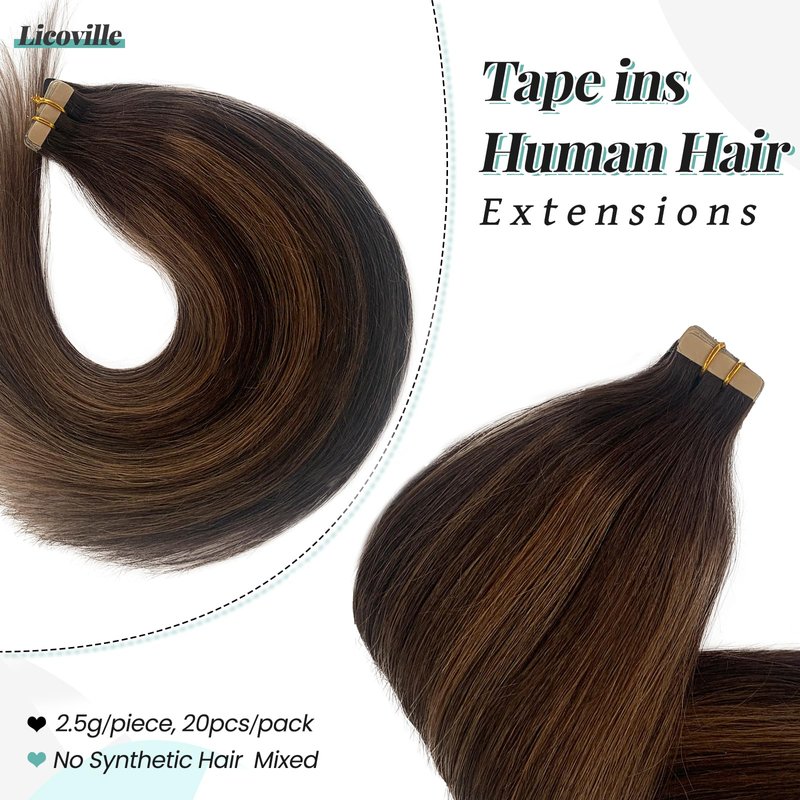 - Tape in Hair Extensions Human Hair: Licoville brown highlight tape in hair extensions are real remy human hair with the consistency of hair thickness from top to ends; can be straightened, curled and lighter colors can be dyed; all the lengths (14in-24in) come with the same weight (50grams), we recommend 1-2 packs to fill the gaps or make your wig thicker, 3-5 packs to cover a whole head for short thin hair