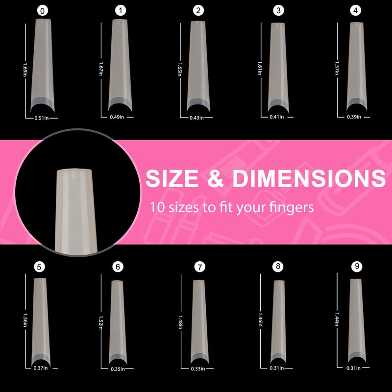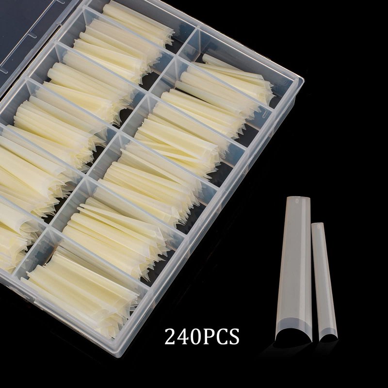 - Tapered Extra Long Nail Tips: 10 different sizes numbered 0-9 individually, totally 240pcs nail tips with clear box, easy to choose the suitable sizes fits your fingers.