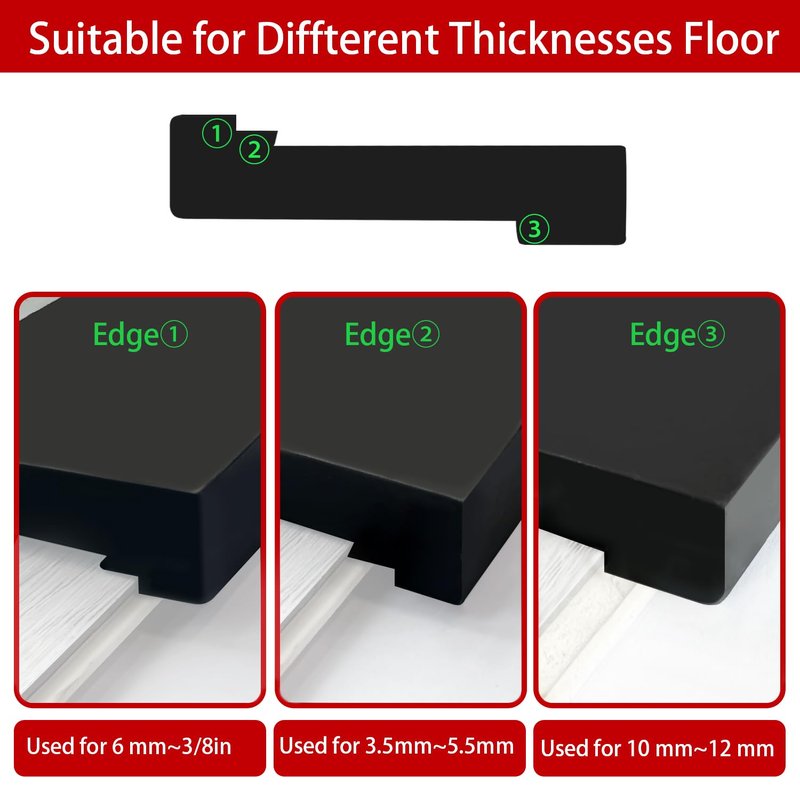 - 🔨【3 Different Edges】With 3 different thickness edges to meet multiple size of flooring. The 1.5mm edge can install with a floor thickness of 3.5 mm ~ 5.5 mm. The 2.5mm edge can install with a floor thickness of 6mm~3/8in. The 3.5mm edge on the other side can install with a floor thickness of 10 mm ~ 12 mm.