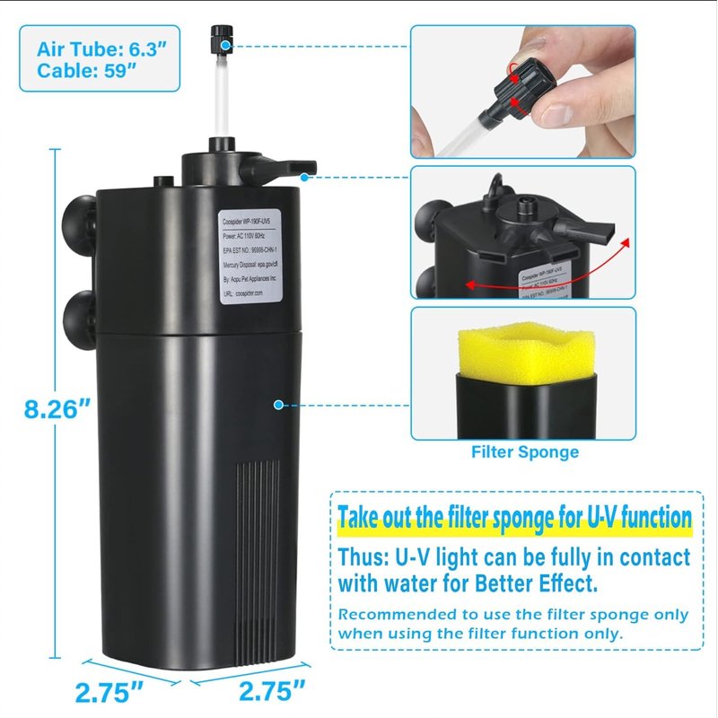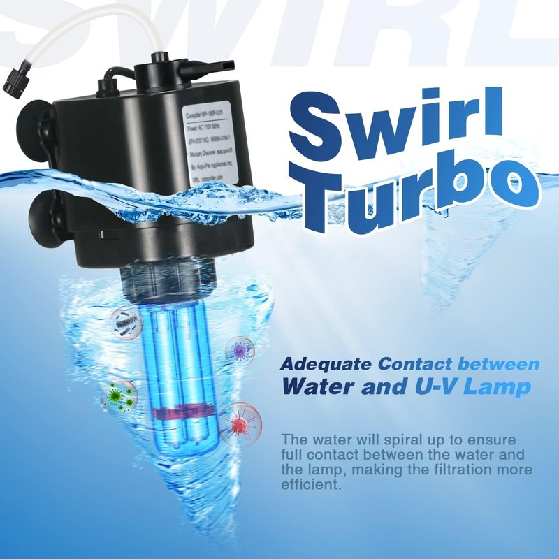 - SWIRL TURBO DESIGN - Water, spiral up, features a twist flow design increase water exposure to U-V light, adequate contact making fish tank pump and filter system more effective.