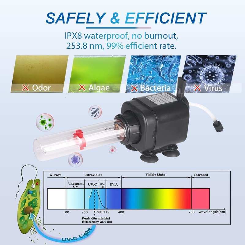 - CRYSTAL CLEAR - Built-in 253.7nm wavelength Green Clear light, UL PLUG, safety and efficiency. Suitable for marine saltwater and freshwater aquariums turtle tank. Clear cloudy odor smelly milky water efficiently.
