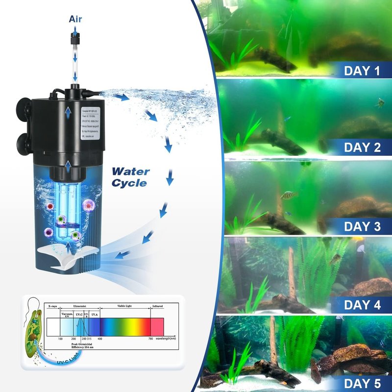 - 4 IN 1 MULTI-FUNCTION,Save Time & Effort - Green killing, reduce odor, quiet air supply pump, wave maker,aqurium water pump & filter. No additional components are required. You can unplug the air tube as a water pump.