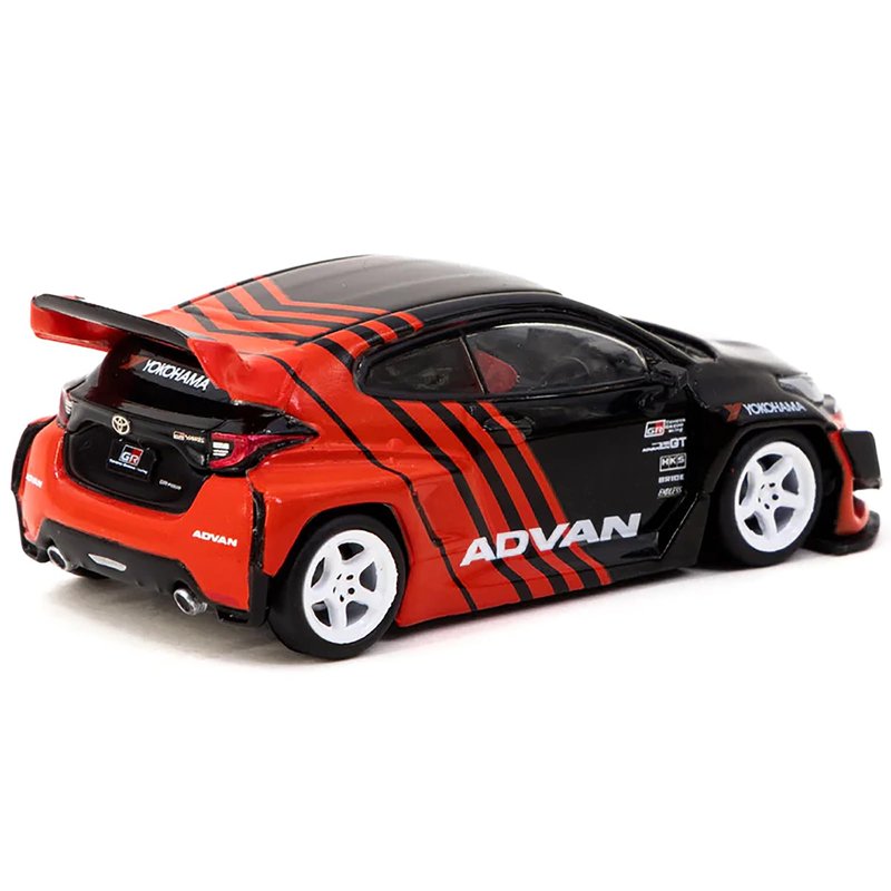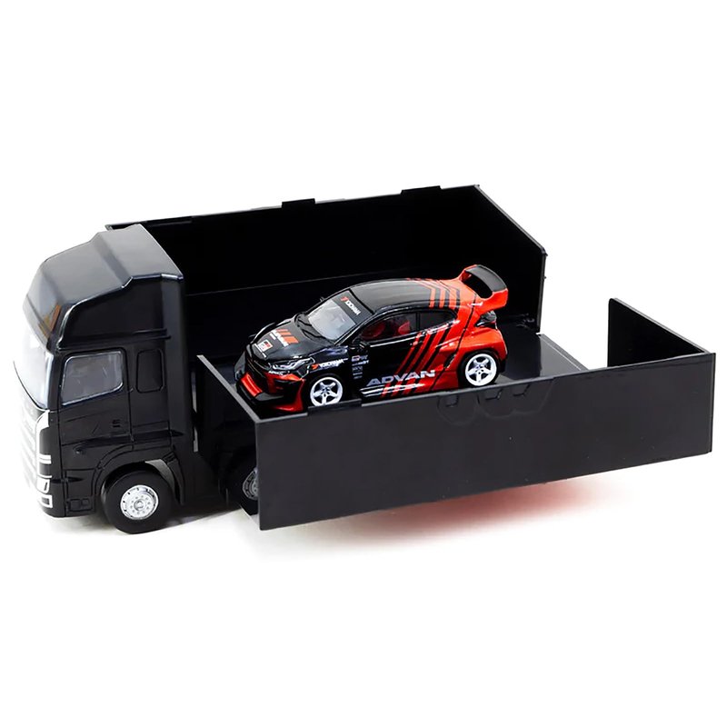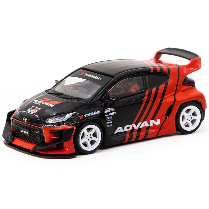 Tarmac Works Pandem Yaris RHD (Right Hand Drive) Red and Black Livery with Plastic Transporter Packaging 1/64 Diecast Model Car T64-080-ADV