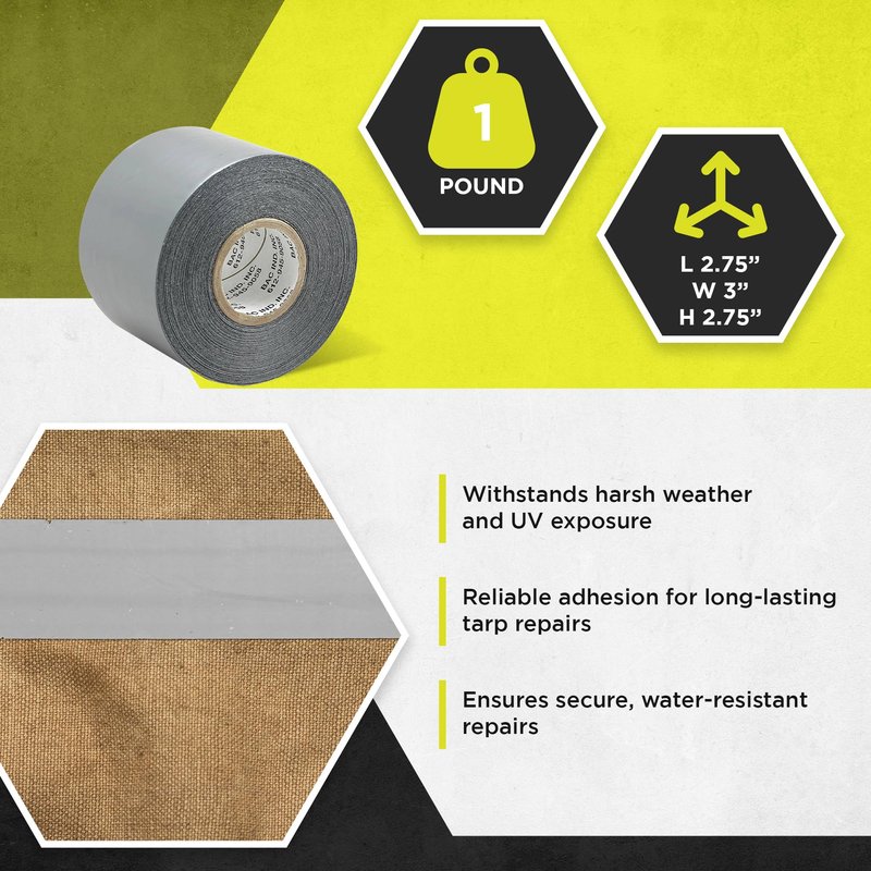 Discover the ultimate solution for tarp repairs and reinforcements with Tarp Tape 3-Inch Duct Tape Adhesive. Crafted to perfection, this sturdy tape boasts a formidable adhesive that firmly sticks to poly, plastics, and vinyl, ensuring a reliable bond that withstands the test of time. With dimensions of 3 inches by 108 feet, this versatile tape offers ample coverage for various repair needs, from fixing rips and tears to seamlessly joining multiple tarps together. Engineered with durability in mind, this seaming tape features a robust rubber adhesive that delivers superior waterproofing and UV resistance. Whether it's for outdoor or indoor applications, Tarp Tape excels in providing reliable performance, making it an indispensable tool for tarps, covers, awnings, tents, hay covers, and more. Featuring a metallic silver color, this heavy duty duct tape blends seamlessly with most materials, ensuring a discreet yet effective repair solution. Tarp Tape isn't just your ordinary duct tape but it's also a versatile companion for a myriad of tasks. From patching up holes and tears to reinforcing stress points for enhanced longevity, its applications are as vast as your imagination. Whether you're tackling a small tear or embarking on a major repair project, this tape is your go-to solution for a job done right. Simply ensure the tarp is clean and laid on a hard surface, then press firmly to achieve proper contact and eliminate air bubbles. With its unmatched performance and ease of use, the 3-Inch Duct Tape Adhesive Ideal for Tarps, Covers, Awnings, and Tents from Tarp Tape is the ultimate choice for maintaining and preserving your outdoor gear and equipment. Keep a roll handy around the house, and tackle repairs with confidence.