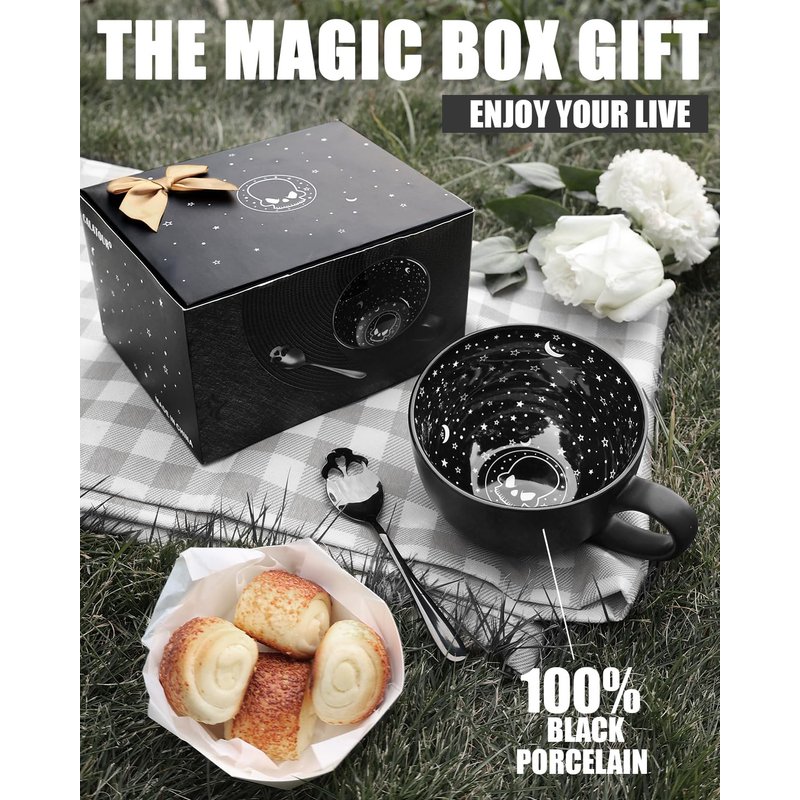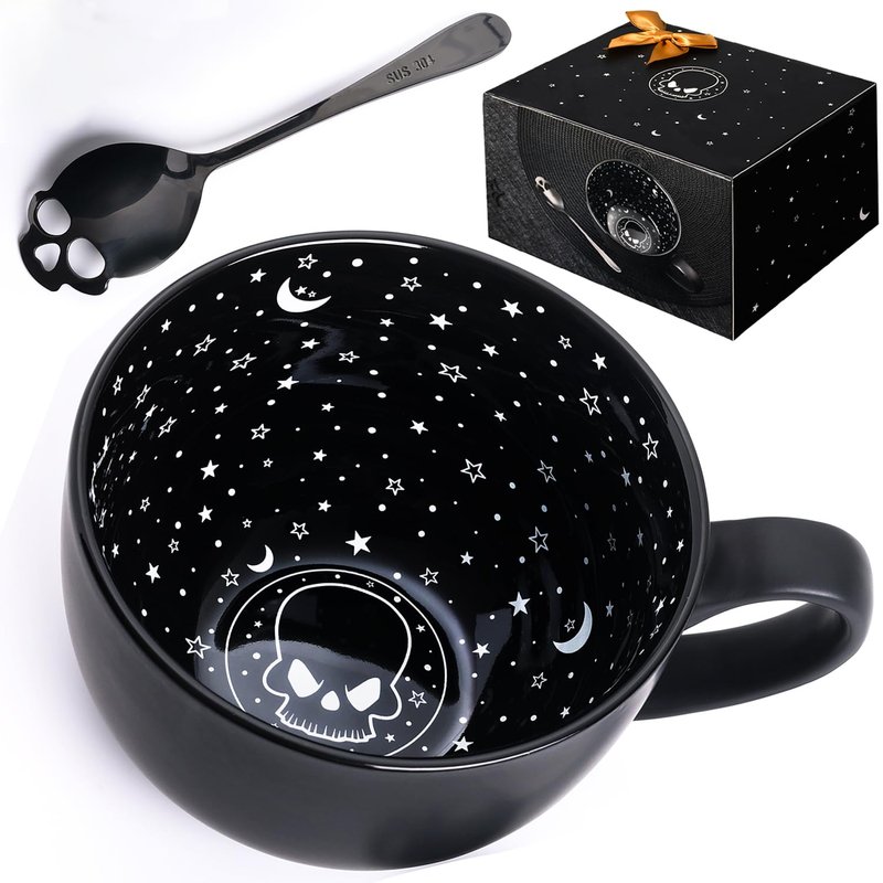 - ☕Novelty Design☕This is a large midnight black coffee mug perfect for your witches brew or Gothic kitchen decor. The cup wall features a magical and exquisite design of the Milky Way galaxy. The bottom of the cup is designed with a skull pattern. It will look beautiful in your kitchen, office desk or personal altar and can also make awesome kitchen witch decor. Spooky gift for Halloween,or for people who love the dark and rock for his. Each cup is designed in an oversized size of 21oz/630ml.