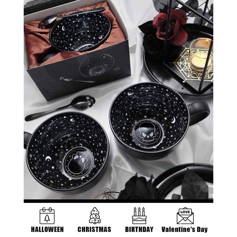 - 🥄Come With A Skull Spoon🥄The black stainless steel (304 Grade) skull-shaped spoon matches the skull at the bottom of the cup perfectly. The openings for eyes and nose not only makes the skull more vivid, but also make it easy to shake off excess sugar to curb your sugar consumption, it's good for stirring. Add a touch of night to your morning coffee or lull yourself into an enchanted sleep with your evening cocoa in the Midnight Coffee Mug. You can also put it with your favorite desserts.