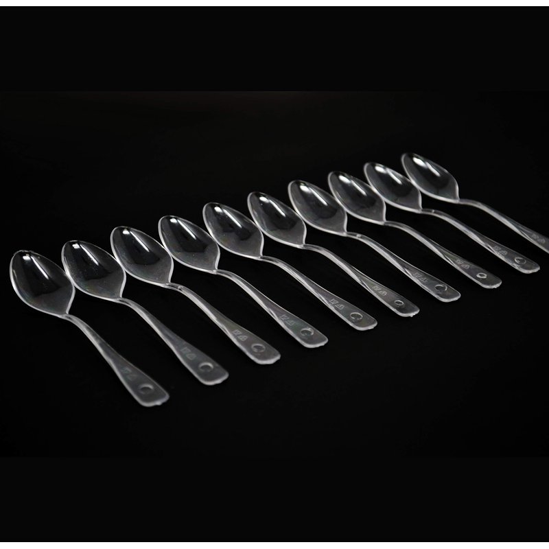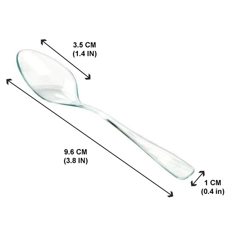 LORESO Tasting Mini Spoons - 100CT Box Complete the show and presentation of your mini appetizers and desserts with these miniature clear plastic spoons. These Mini Spoons can easily be used to complement all types of fares, tablespaces, and decors. -Premium plastic construction with sturdy handles. Conveniently disposable and fully recyclable, BPA free. Product Material: Plastic Product Color: Clear Pack Size: 100 count Product Dimensions: 3.8''L x 0.4''W x 0.3''H