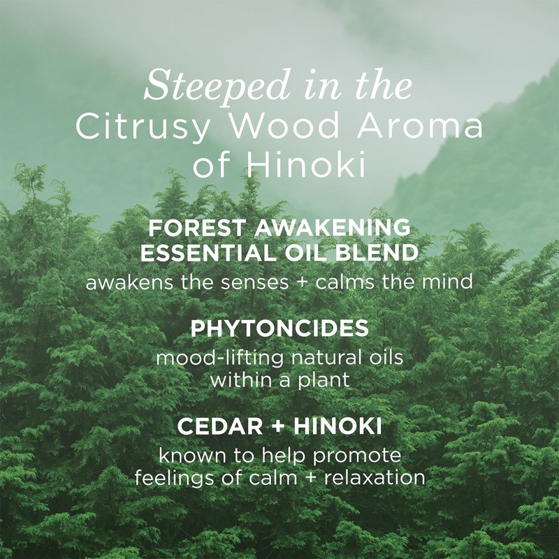 - FEATURED INGREDIENTS: Forest Awakening Essential Oil Blend: Includes cedar, hiba, and hinoki, oils known to contain organic compounds proven to reduce stress, lift mood, and help improve well-being. Natural Hinoki Oil Blend: Helps lock in moisture and provide suppleness to the skin.