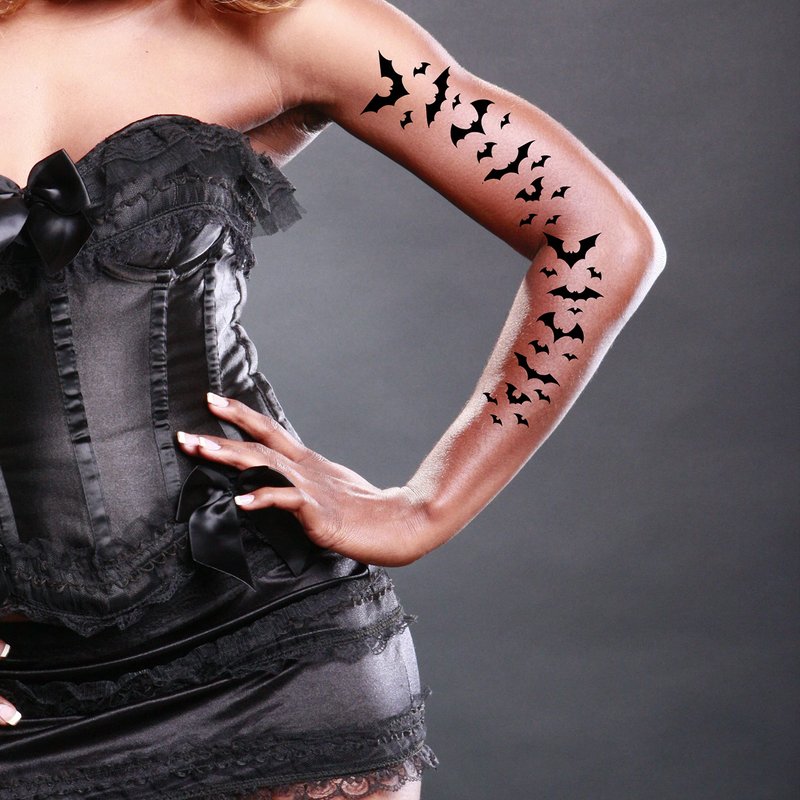 - SAFE FOR ALL SKINS BLACK VAMPIRE HALLOWEEN FLYING BATS TEMPORARY TATTOOS - contains 1 sheets vampire halloween bat temporary tattoos which are printed with non-toxic ink, Your friends will think you had a new viking style tattoo! Great fun for parties, cosplay, halloween, special events Also for testing to see if you like a real tattoo look like