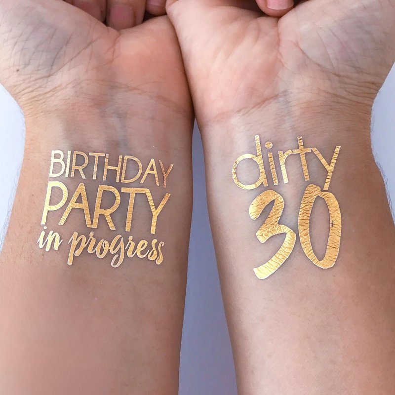 - ✅You are ordering a set of 12 metallic gold temporary tattoos (6 Dirty 30 + 6 Birthday Party in Progress)
