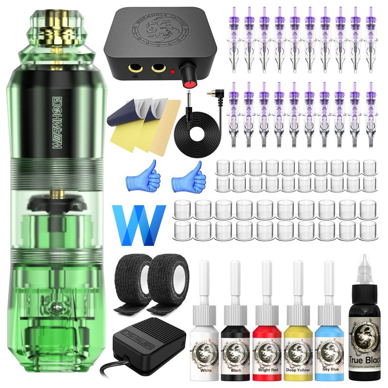 - 🎁COMPLETE TATTOO KIT: The Wormhole tattoo kit includes a tattoo pen with RCA cord, tattoo power supply, foot pedal, 11 color tattoo ink, 2 transfer paper, 2 self-adhesive cover, 20 tattoo cartridge needles, 40 tattoo ink caps with base, 1 clip cord sleeve, 1 pair disposable glove, 4 disposable tattoo bibs, 1 tattoo practice sheet, 1 user manual. A very perfect combo for beginners.