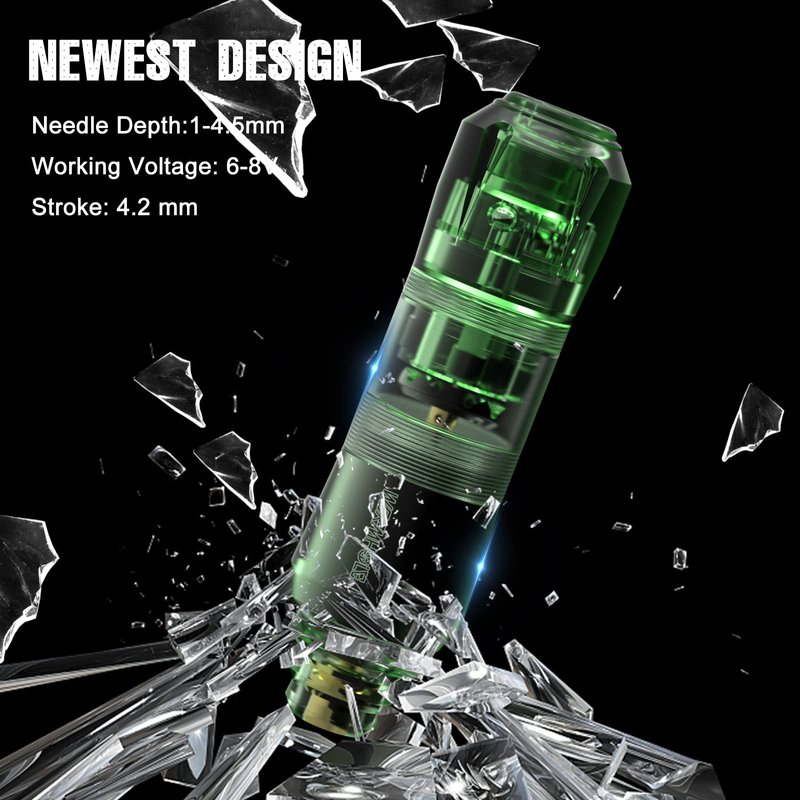- 🖊️NEWEST DESIGN: 1 piece tattoo pen with RCA interface, that runs smoothly and almost silently, which can meet all your tattoo needs. The transparent pen body helps you see the motor in action. Needle protrusion: 1-4.5mm. Length of the stroke: 4.2mm. Working voltage: 6-8V. The tattoo machine has exquisite workmanship, features a powerful motor and an advanced gear system, continuous operation not hot, and low noise.