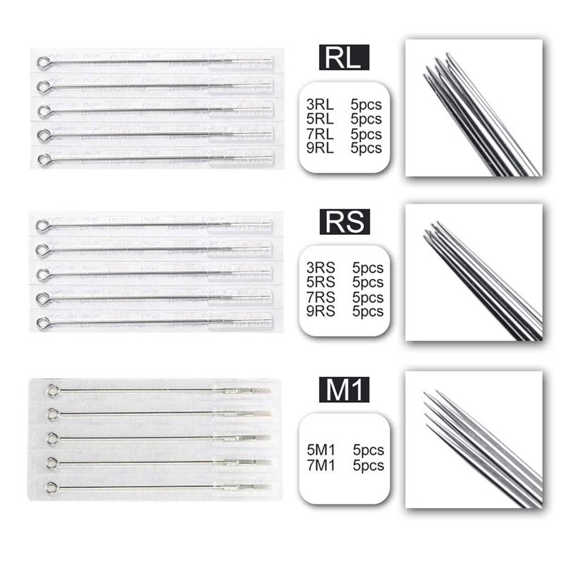 - ★ Tattoo Needles & Tips Set: 5pcs of each 3RL, 5RL, 7RL, 9RL, 3RS, 5RS, 7RS, 9RS, 5M1, 7M1 tattoo needle. 5pcs of each 3RT, 5RT, 7RT, 9RT, 3DT, 5DT, 7DT, 9DT, 5FT, 7FT tattoo needles' tips.
