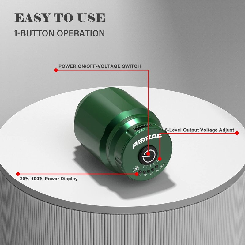 - â¡ADJUSTABLE VOLTAGEâInput voltage: DC 5V/1A , Output Voltage: 6V - 11V. Padieoe wireless tattoo power supply uses a Single Button and motion to control. Click the power button to adjust the voltage 6 7 8 9 11V, which can meet your different needs and can display the remaining power supply energy.