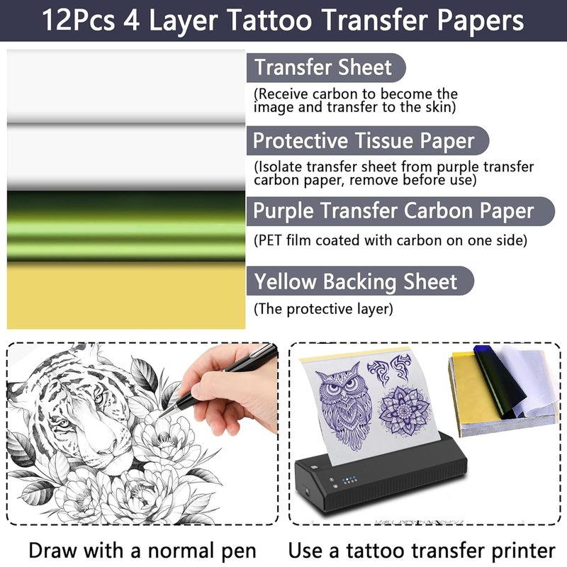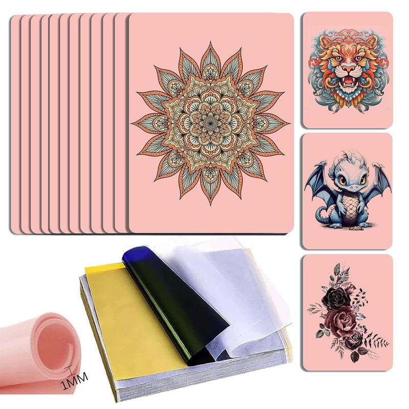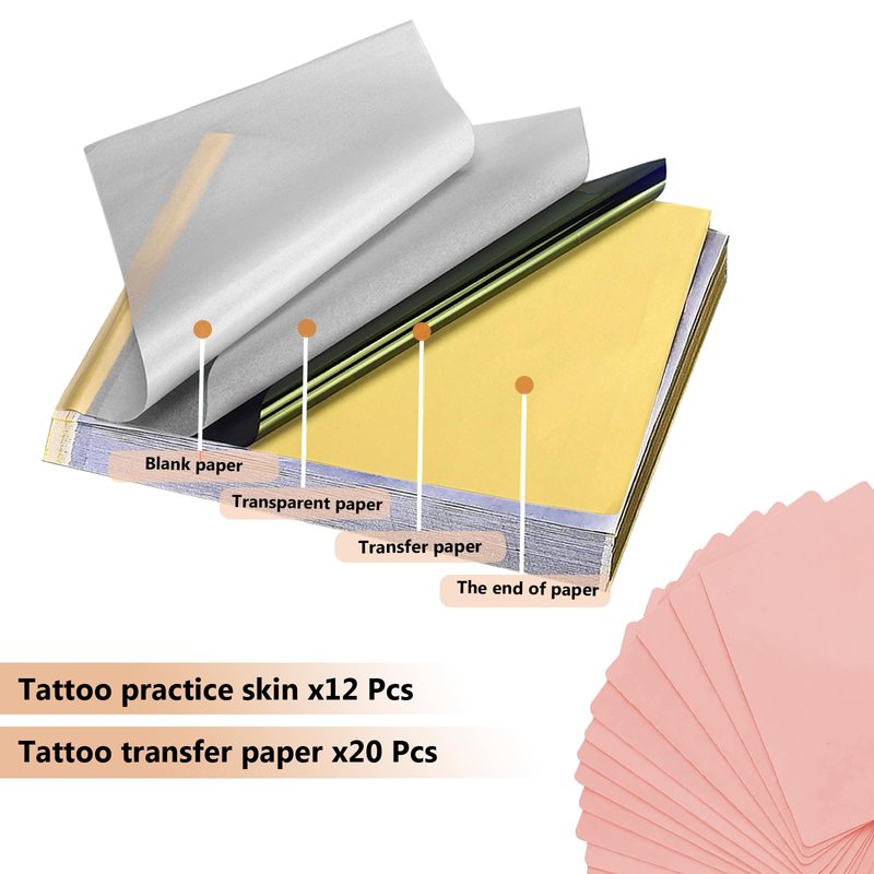 - 【MEET ALL YOUR NEED】The package contains 12pcs 7.6x5.4" tattoo practice skins (Thickness 1mm) and 20pcs 11.6x8.2" tattoo transfer papers. Both products are essential and can save you time when purchased in combination.