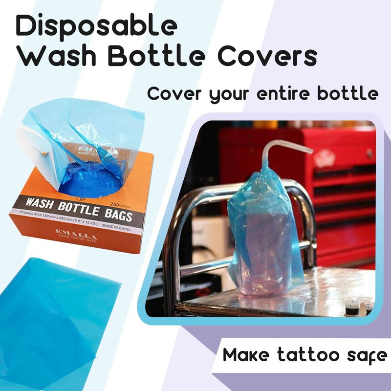 - TOP MATERIAL - The individual package tattoo wash bottle covers was made of high quality clear polyethylene. Transparent, you can easily identify the liquid of the bottle covered so it will not affect your tattooing