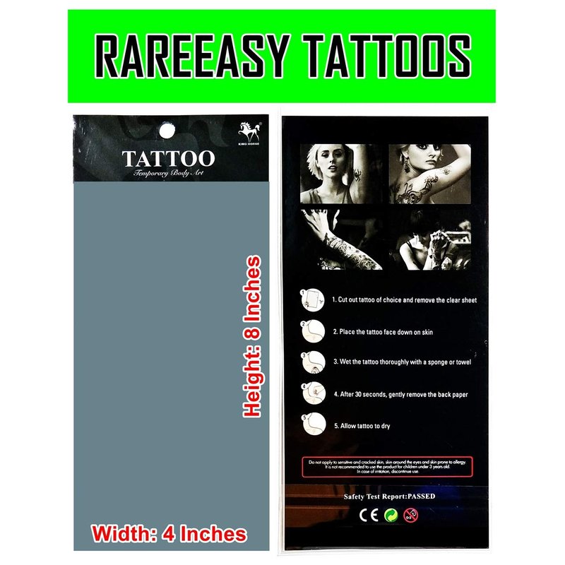 How to use: 1. Cut out tottoos of choice. 2. Remove clear, protective top sheet. 3. Press tottoo firmly onto clean, dry skin with design face down. 4. Wet tattoo thoroughly using wet sponge or cloth. 5. Peel off paper backing after 30 seconds. pat dry. 6. Tattoos can be removed by washing with soap and water. To remove tattoos more easily, you can use a drop of body oil.