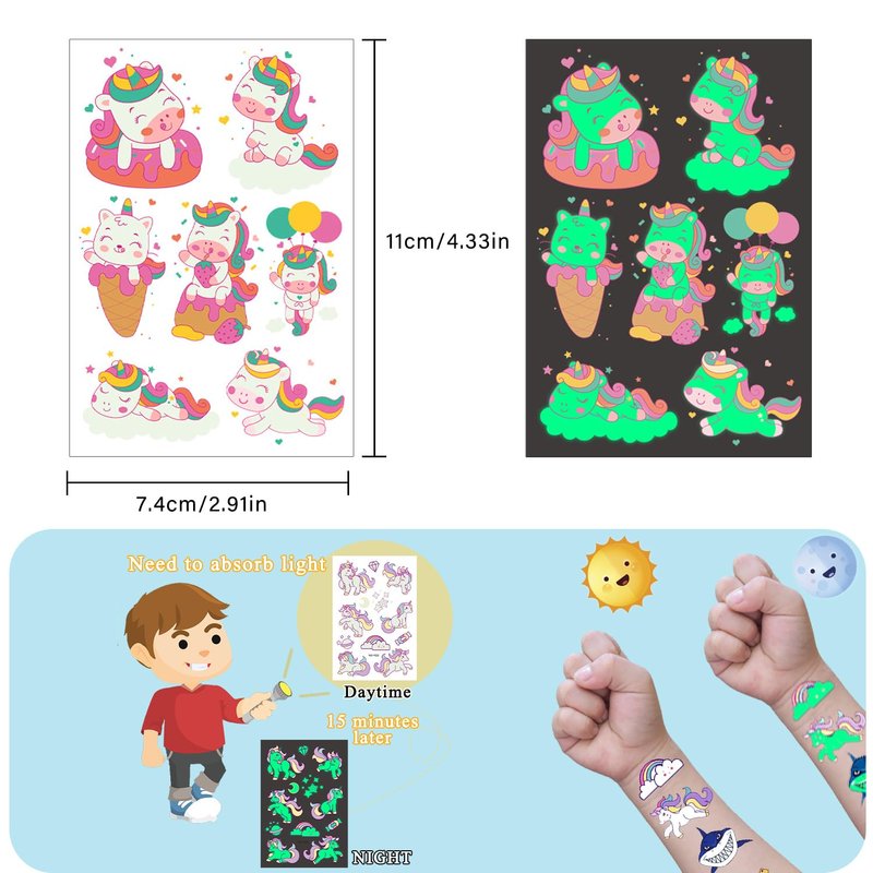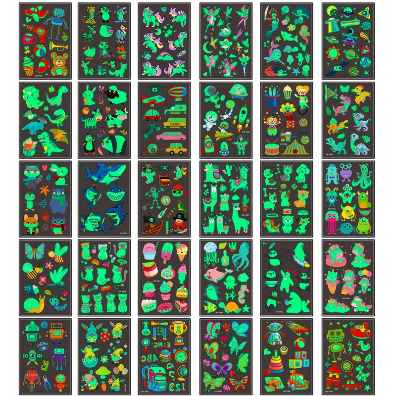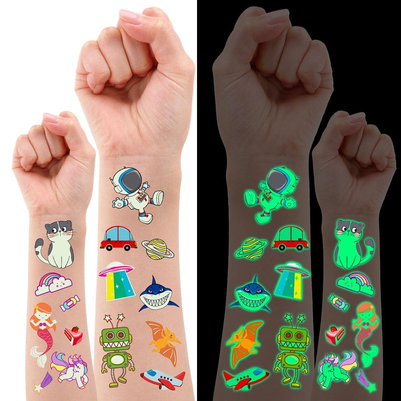- Great Variety: You will receive 30 Sheets 400 glow in the dark tattoos. Fun and vibrant cute style. No repetitive designs. Temporary tattoos contains animal unicorn mermaid space dinosaur butterfly pirate car shark dog cat robots monster circus etc