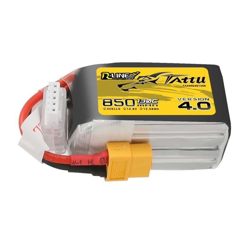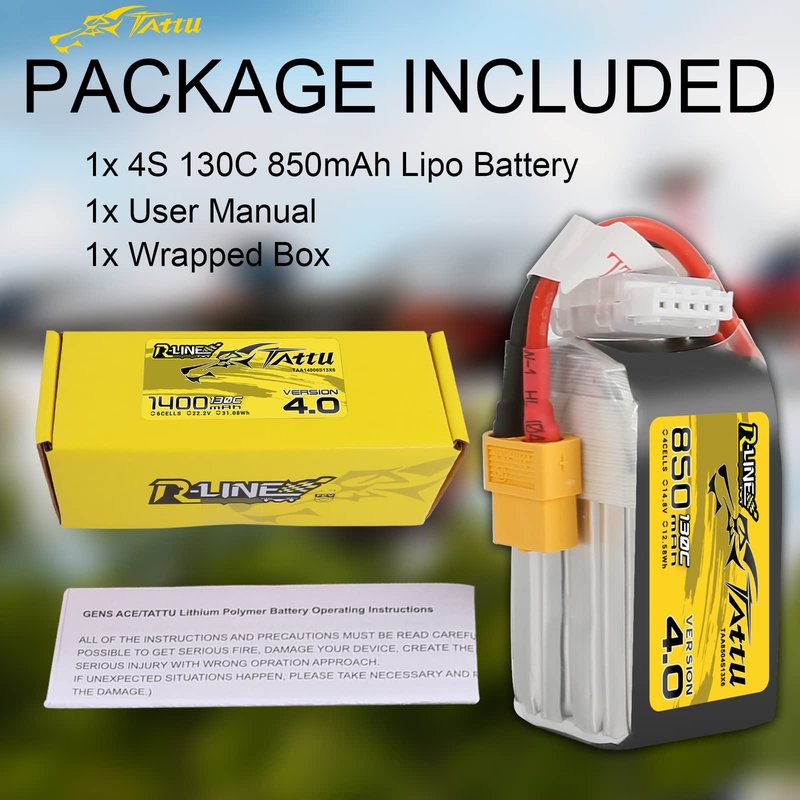 - Tattu 14.8V 850mAh Lipo battery Specification:Battery Voltage:14.8V;Configuration:4S1P;Capacity:850mAh;Discharge:130C;Plug: XT60 Plug