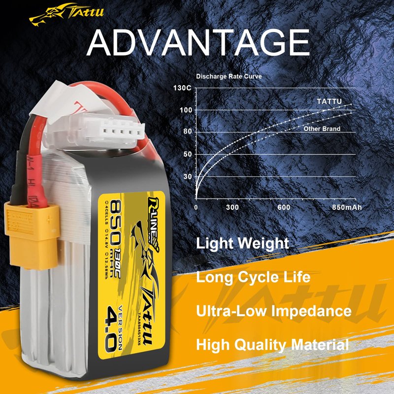 - High Performance: Tattu 4S 850mAh Lipo battery with 130C discharge rate offers high power and very long time for your RC Model