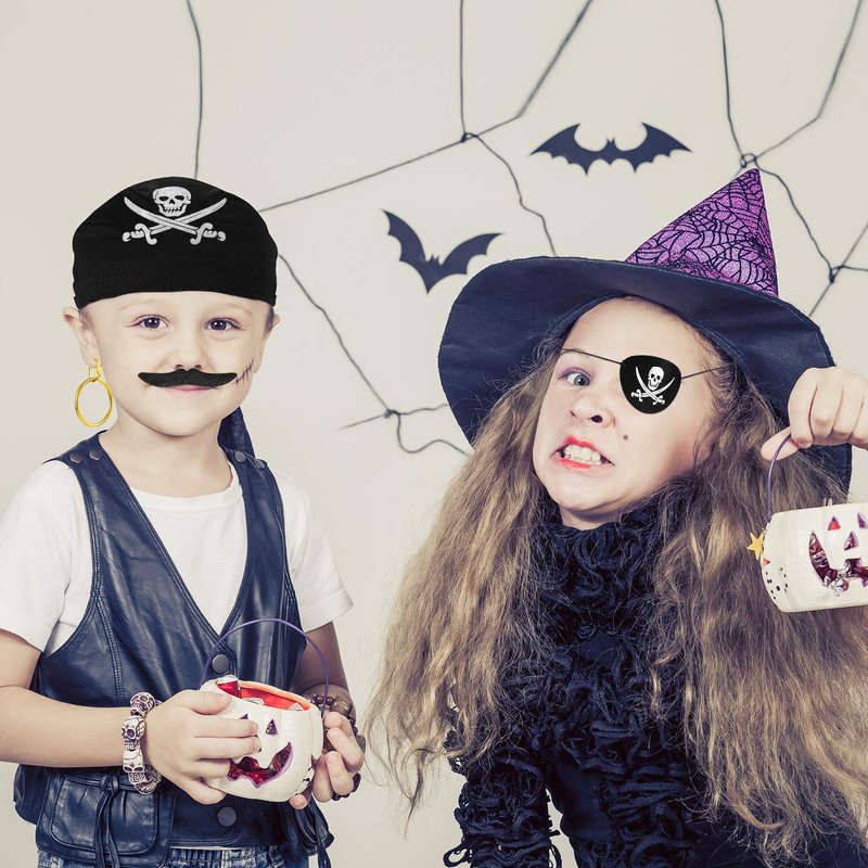 - Products includes: 6 pieces black felt pirate eye patches, 6 pieces pirate gold earrings, 6 pieces pirate black headscarves, 12 pieces pirate fake mustache with 6 different styles