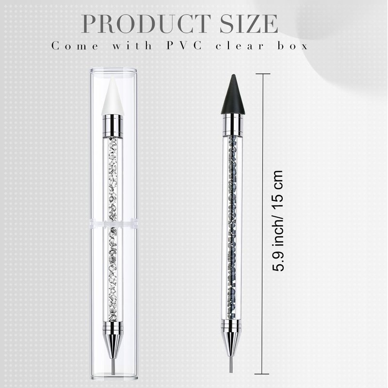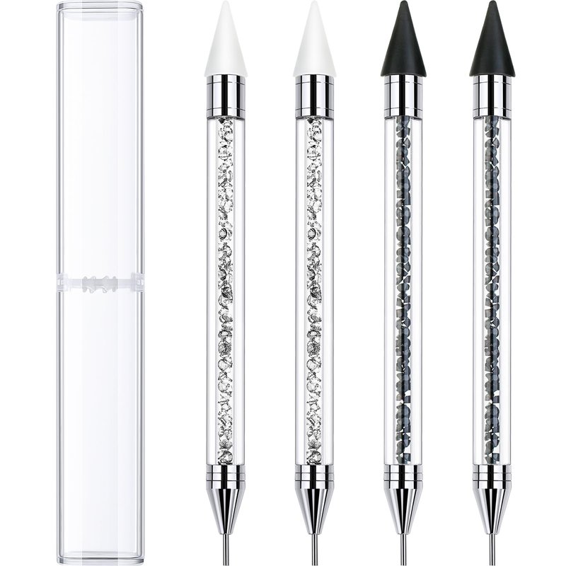 4 Pieces Rhinestone picker dotting pen, dual ended rhinestone gems crystals studs picker wax pencil pen crystal beads handle manicure nail art DIY decoration toolCharacteristic: A nice gift to your friend or family who love to DIY nail art. Ideal for fine nail art work, suitable for professional use or home use. Dual ended rhinestone dotting pen: The wax dotting pen tip is for picking rhinestones and the stainless steel tip presses them to stay on the nail surface or use to pick the drilling mud. Meet different needs during your crafts. Delicate design for picking rhinestones: Metallic body, studded with rhinestone, non deformation and non corroding, reliable for longer use. Self adhesive wax tip: Makes rhinestones placing on natural nails, false nails, acrylic nails or on toe nails easily and more accurate. Specification: Material: Handle: crystal and acrylic Head: wax and stainlessLength: 5.9 inch/ 15 cmColor: white, blackPackage includes: 4 x Nail rhinestone picker wax pencil pen4 x PVC clear boxWarm notice: When you receive rhinestone picker pen, please put the wax tip on the top of the pen.