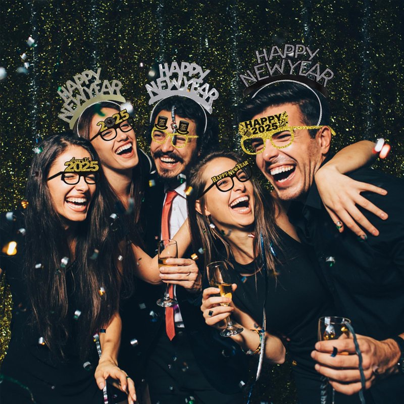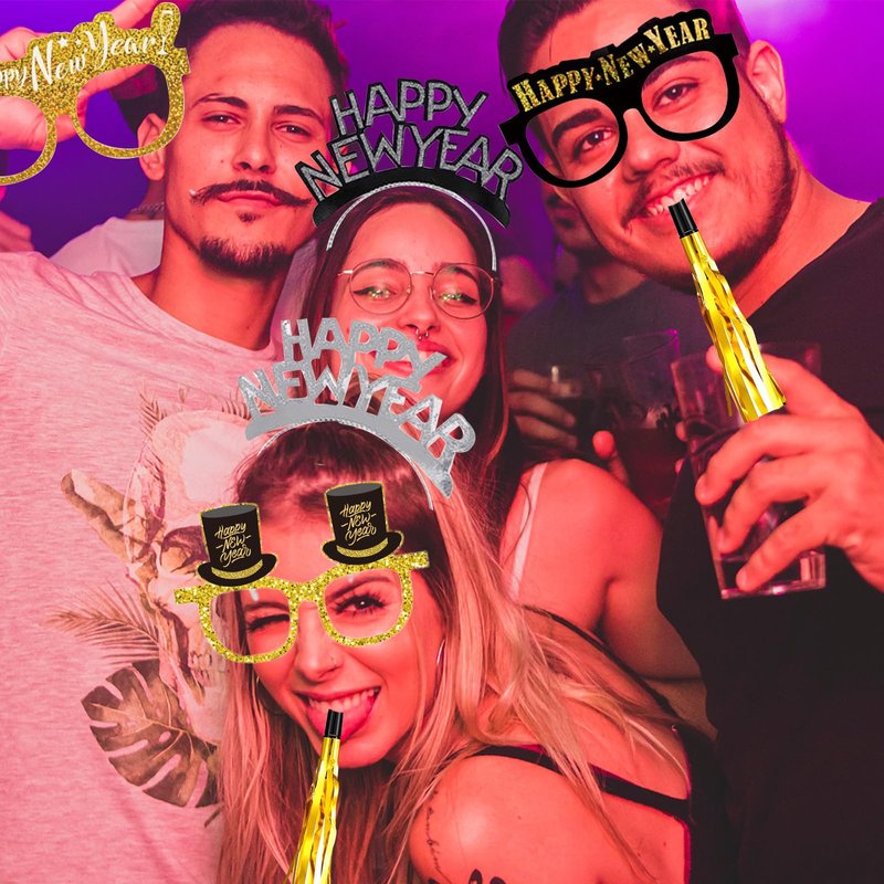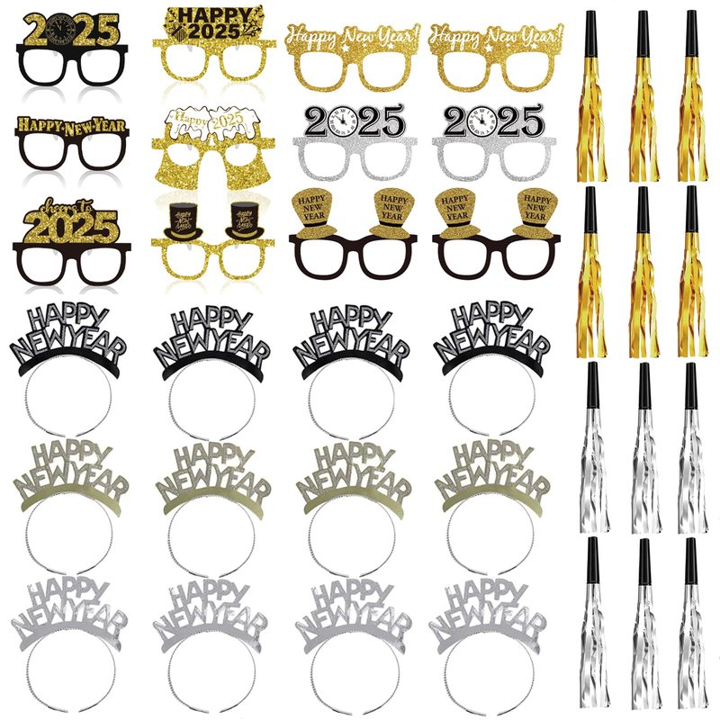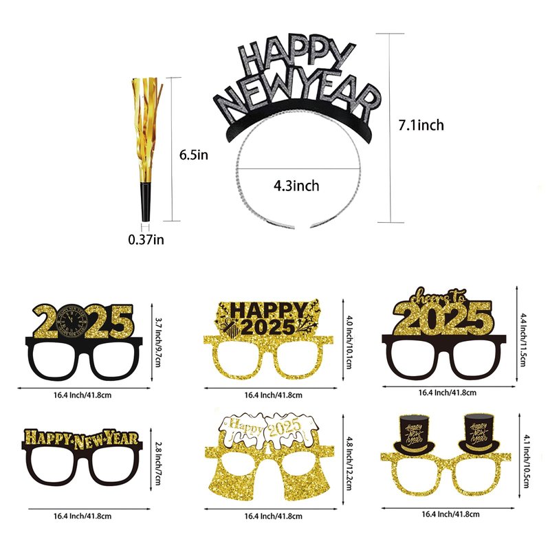 - 【Safe to Use】Our Happy New Year headbands and glasses are made of quality cardboard paper, stable not easy to deform, and comfortable to wear. The flashing metal tassel noise maker is made of high-quality plastic, safe and non-toxic, not easy to break, high quality can be used for a long time. Make a cheerful sound at your upcoming 2025 New Year's Eve or Christmas party.