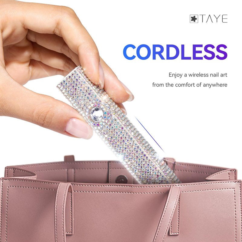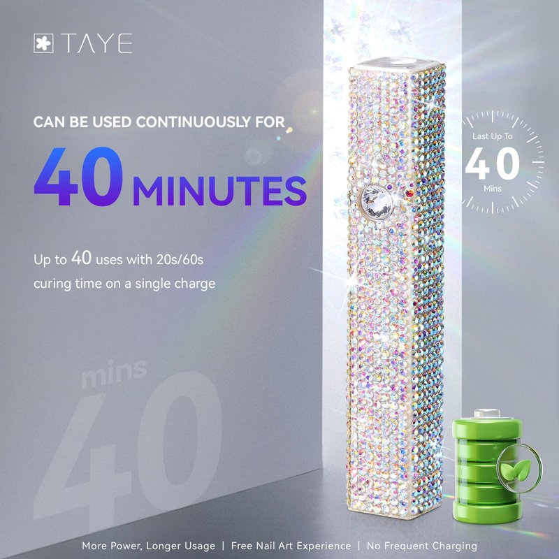 - 【 Cutting-Edge & Lnnovate UV Light 】The TAYE UV light for nails boasts an eye-catching Set with diamonds design, Equipped with high-quality lamp beads emitting 365 + 405nm, with convex lens to achieve 5 times amplified spotlight, It significantly reduces curing time and ensures even curing from multiple angles, Easy to paste nail charms, nail gems, uv nail stickers, gel nail polish more, Efficiently solving the difficulty of curing nail gels.