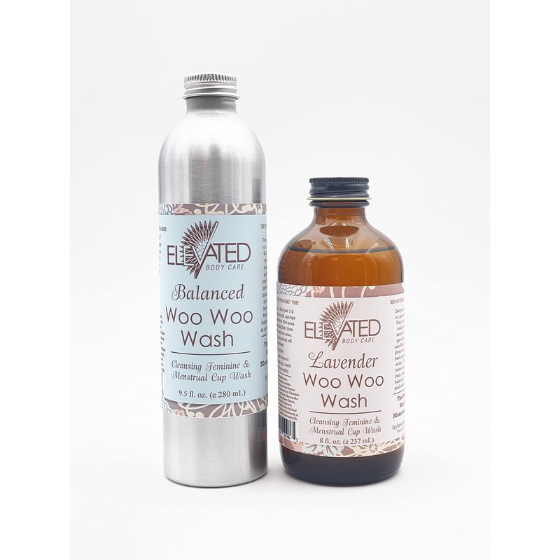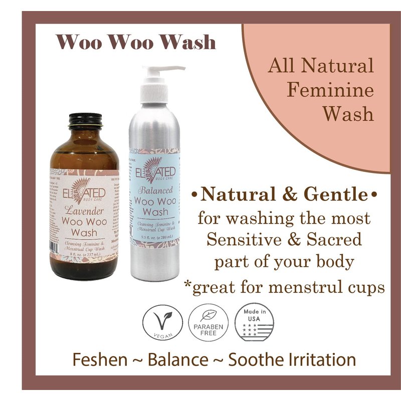 Taylor’s Naturals Elevated Woo Woo Feminine Wash. Available in Amber Glass (8oz) or Aluminum (8.5oz) bottles. With or Without a pump. GENTLE & EFFECTIVE: Our gentle Woo Woo Wash is perfect for washing the most sensitive and sacred part of your body. Keep {down there} sweet n' fresh and keep owies at bay! It will also keep you moisturized and balanced - keeping dryness, irritation and owies away. ** EVERY DAY, MENSTRUAL CUPS, MOON CYCLES & POST-PARTUM: Great for Menstrual Cups and keeping fresh during your cycle. Perfect for Post Partum owies and soreness – making it a great baby shower gift. TO USE: Add just 1-2 tsp. into a puff, sponge or washcloth. Wet area of cleansing first, then gently wash the area. RINSE completely off. Use as needed. To wash CUPS: Add a few drops to menstrual cup, wash & rinse thoroughly. ** 100% PURE NATURAL INGREDIENTS: Distilled water, herbally infused raw virgin macadamia nut oil (calendula, chamomilla, comfrey, uva ursi, chickweed), organic coconut oil (saponified), essential oils (Balanced = clary sage and orange |Lavender = lavender). VEGAN and Cruelty Free, and NEVER any dyes, artificial colors or fragrances. Zero-Low Waste packaging. Handcrafted in small batches in the USA by Taylor’s Naturals – a woman owned company making products good for you while keeping our precious planet in mind – always focused on quality, integrity and sustainability. ** Look for other ALL NATURAL products from Taylor’s Naturals, including Elevated Muffin Mist and Puanani Paste (or all 3 products in our Ladies Bestie Kit). And don’t forget the kids – Balm! Baby brand is known for its diaper balm, teething rub & tincture and teeth paste!