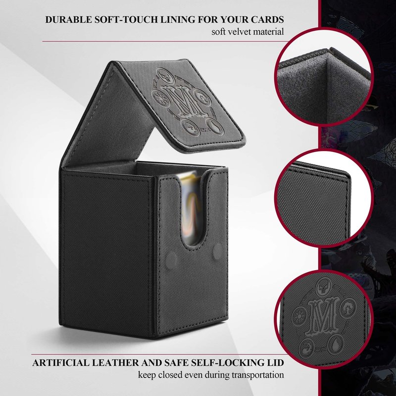 - 𝗔𝗹𝗹-𝗿𝗼𝘂𝗻𝗱 𝗣𝗿𝗼𝘁𝗲𝗰𝘁𝗶𝗼𝗻: The MTG 100 card deck box exterior is made of PU leather and interior soft velvet material, which is able to withstand strong pressure while protecting your cards. Perfect choice of moving your deck around with you.