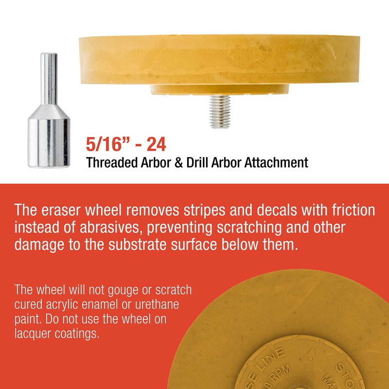 - Safe: The eraser wheel scrubs off the stripes and decals with friction instead of abrasives, preventing scratching and other damage to the substrate surface below them. It will not gouge or scratch cured acrylic enamel or urethane paint. Do not use the wheel on lacquer coatings.