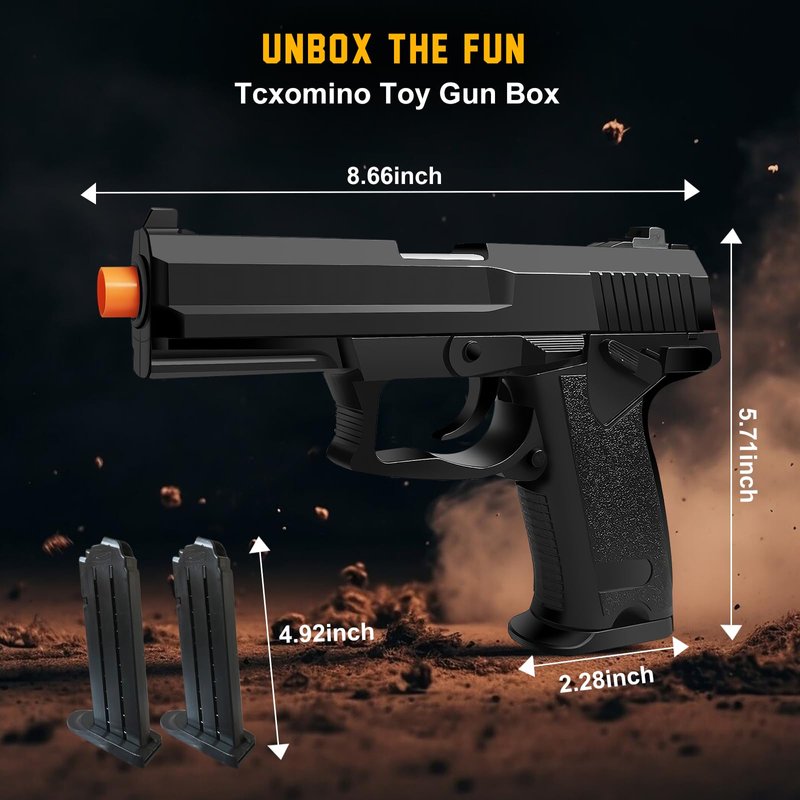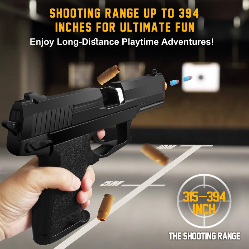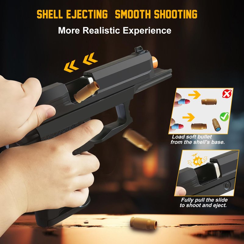 - [Realistic Shell Ejecting Design]This innovative toy gun features a realistic shell-ejecting mechanism, adding to the immersive play experience. Load, shoot, and watch the shells pop out, bringing a true-to-life feel to every play session. Note that the slide needs to be pulled all the way to eject the cartridge case.