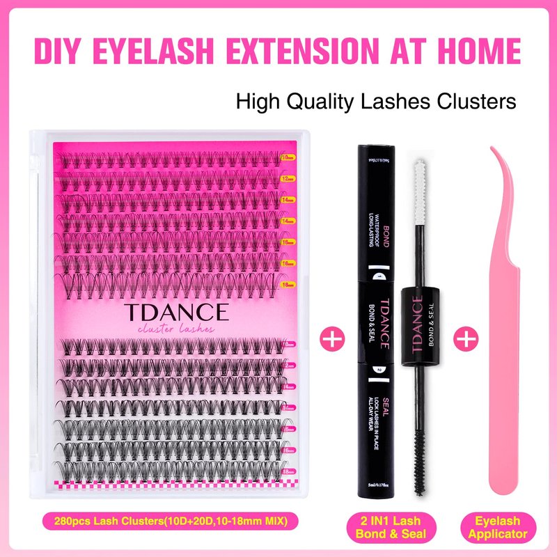 - 🎀【All-Inclusive DIY Lash Extension Kit】 The TDANCE cluster lash kit provides everything you need for your shiny lashes. You will get 280 PCS cluster lashes, 1* lash bond and seal,and 1* lash applicator per box. Bring salon-quality eyelash extensions to your home in just 3-5 minutes with the TDANCE eyelash cluster kit.