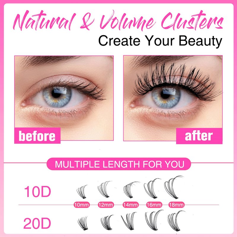 - 🎀【Bring Salon to Home】10-16mm mixed lengths lash clusters provide you with multiple choices. You just need to spend several minutes creating cat eyes look, a natural look, or a dramatic look depending on the occasion and your mood, everyone can enjoy the effect of a professional salon at home, which helps you save a lot of time and costs.