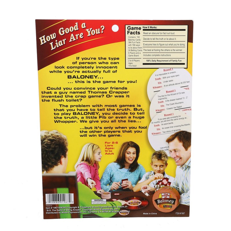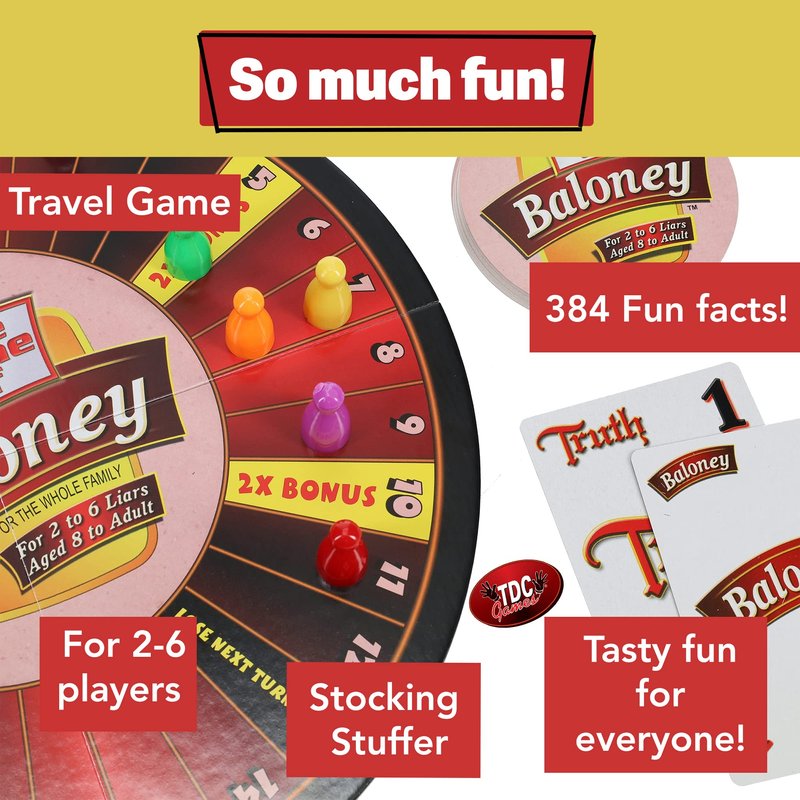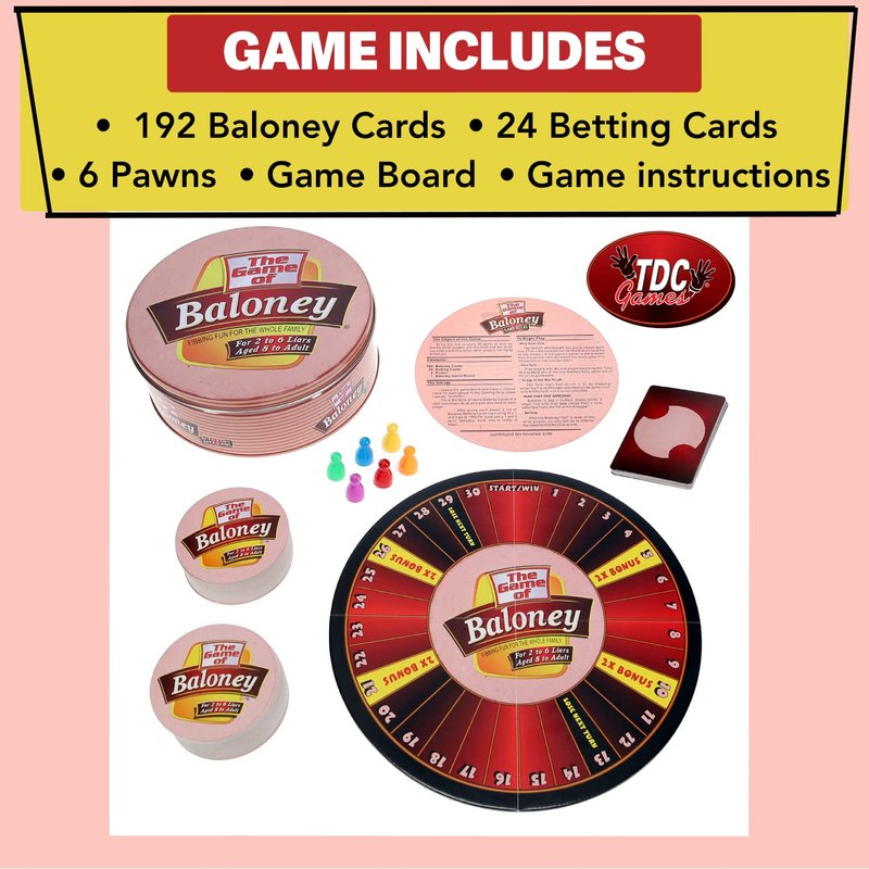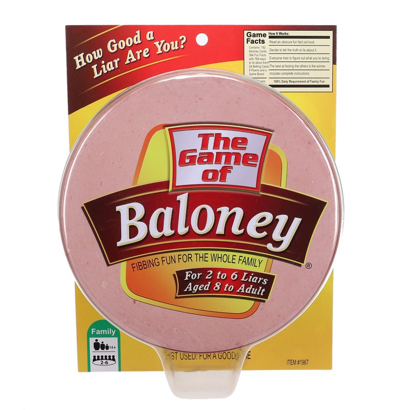 - THAT'S BALONEY: A fibbing game for the whole family! Each player decides to lie or tell the truth while keeping a straight face. The goal is to fool your opponents. Contains 192 Baloney cards, 384 fun facts, 24 betting cards, 6 pawns and a game board