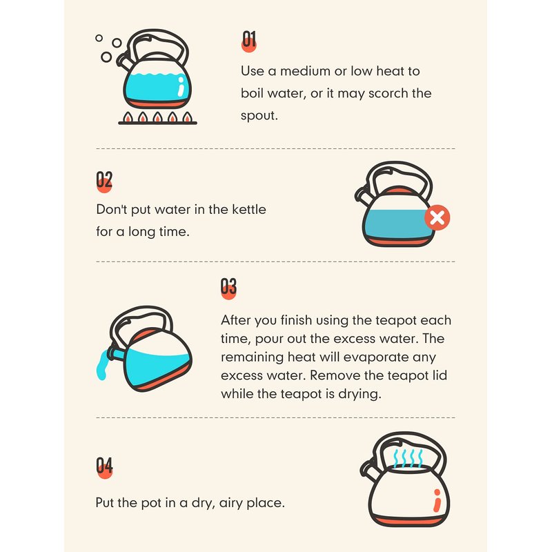 - [ Lond Whistling Sound ] Loud & automatic whistling catch your attention even in a noisy environment. When you focus on your housework, movies, music, or any other things, the teapot will remind you with a whistle after boiling water. To prevent you from forgetting to turn it off and drying the water up.