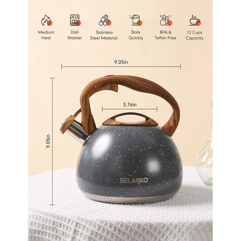 Tea Kettle, 2.7 Quart BELANKO Teapot for Stovetops Wood Pattern Handle with Loud Whistle Food Grade Stainless Steel Tea Pot Water Kettle - Gray