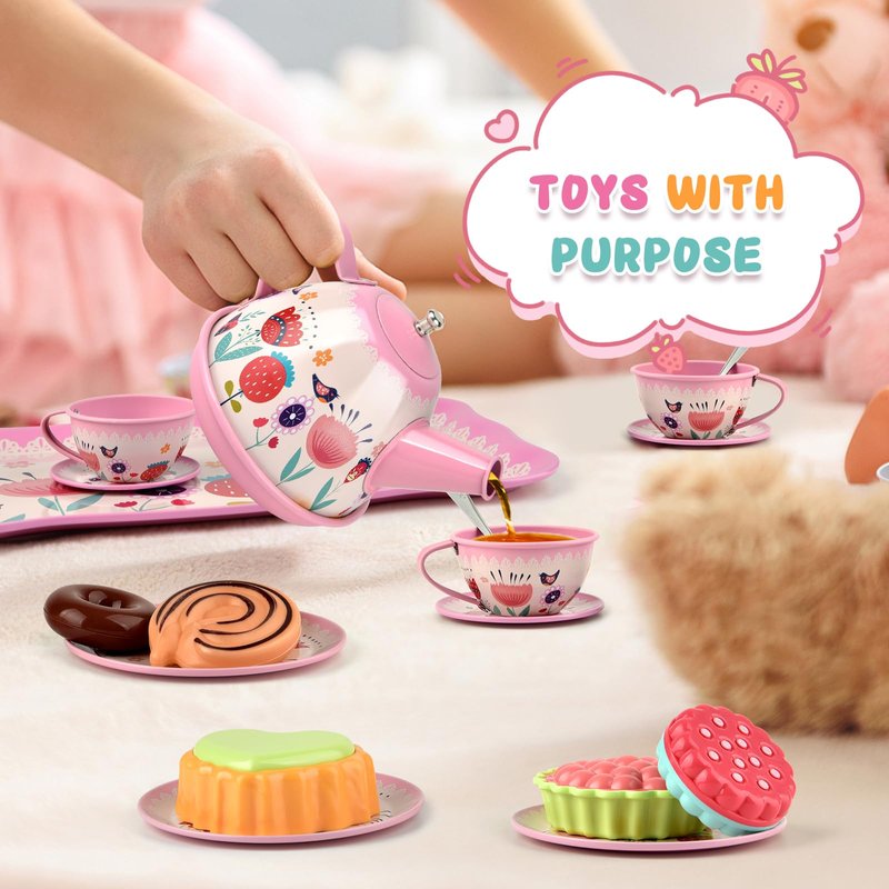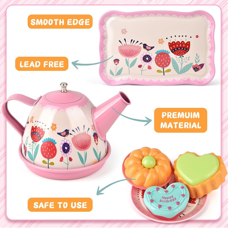 - 🍵【SAFETY TEA PLAYSET】The tea toy set is made of premium quality non-toxic and harmless tin material, smooth cup mouth, carrying case with alloy handle for easy carry. Tip: all pieces can be easily cleaned with damp cloth and air-dried after use.