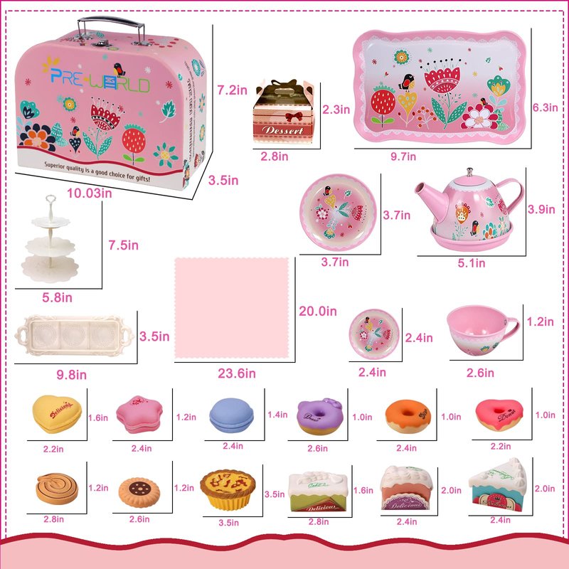 - 【Premium Quality】This tea set for little girls is made of non-toxic tin-coated iron material, good formability, corrosion resistance. The dessert accessories providing harmless plastic material, has long-lasting strength and use. Endless hours of tea time theme pretend role play for your kids.