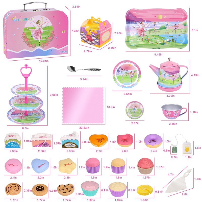- 【53PCS Kids Pretend Musical Tea Set】Includes 1 teapot,1 serving tray,4 teacups,4 coasters,4 plate,4 spoons,1 3-tier tray cake stand(made of 8 pieces), 1 cake shovel, 1 cake box, 1 tablecloth, 1 carring case and 23 pieces of pretend food with a variety of doughnuts,macarons,cakes,lemon slices,tea bag. Rich pretend tea party dessert accerrrories,create hours of fun playtime for kids